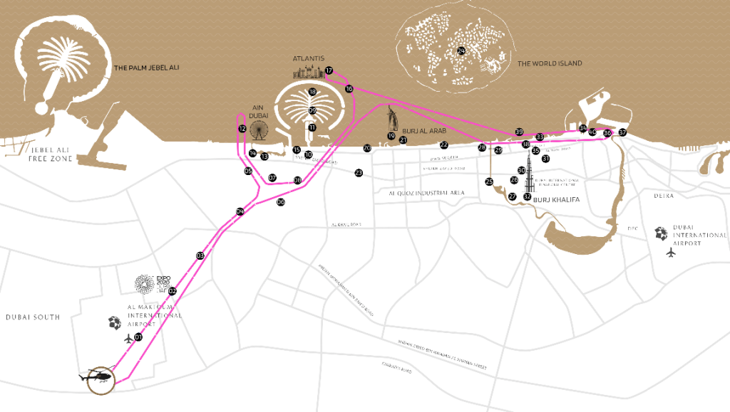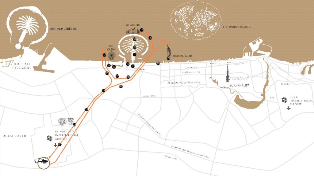Welcome to Dubai Helicopter’s premier heli tour! Experience the thrill of flying in our modern helicopter fleet, with convenient premium pick-up and drop-off services within Dubai city limits. Soar above the city’s most iconic landmarks on an extended tour. This competitively priced package is a must-try for anyone visiting Dubai!